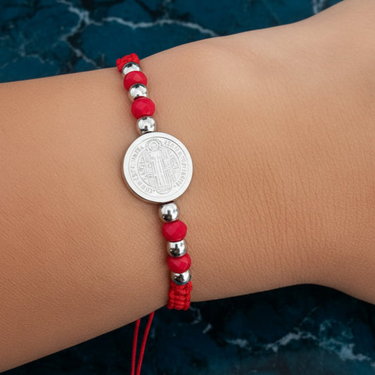 Pulsera Mujer Medalla San Benito Plateada e Hilo Rojo