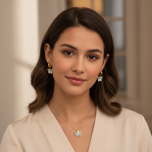 Collar Mariposa Dorado + Topos Brillantes en Acero