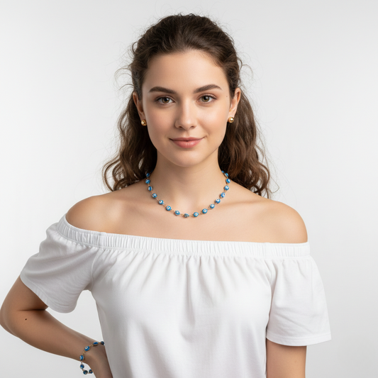 Set Collar y Pulsera Ojo Turco Azul Mujer + Topos Acero Inoxidables
