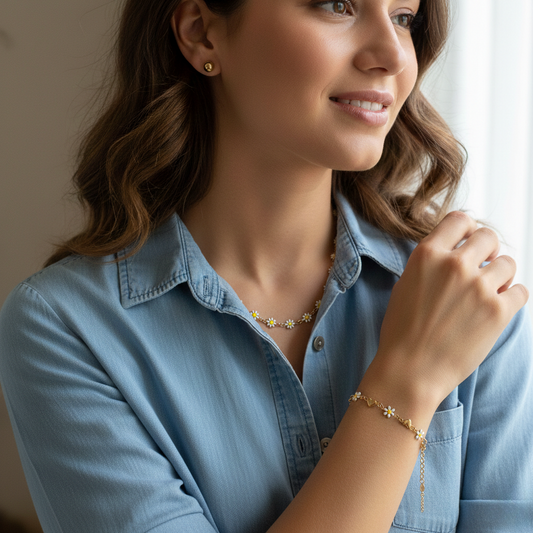 Set Collar y Pulsera Margaritas Mujer + Aretes Dorados