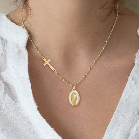 Collar Virgen Guadalupe Blanca + Cruz Dorada & Topos