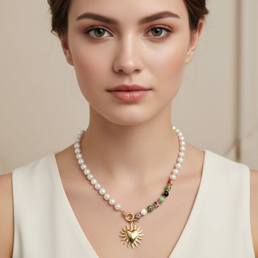 Collar Corazón de Fuego Perlas y Murinas Multicolor + Topos