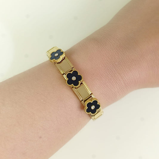 Pulsera Flores Negras Zircones Dorada