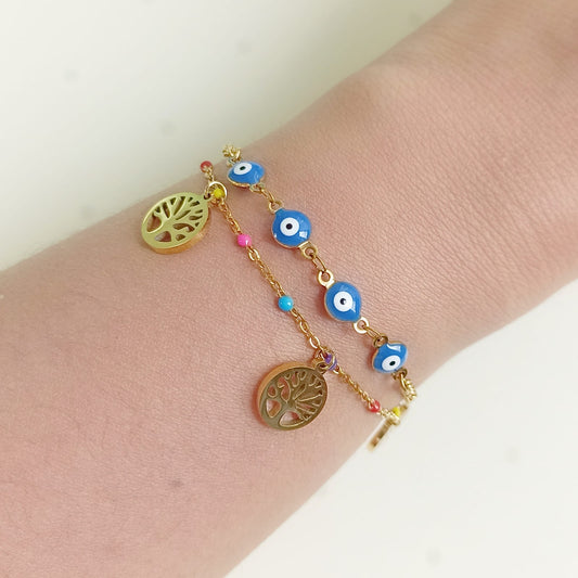Pulsera árbol de la vida y Ojos Turcos Dorada