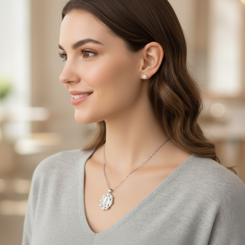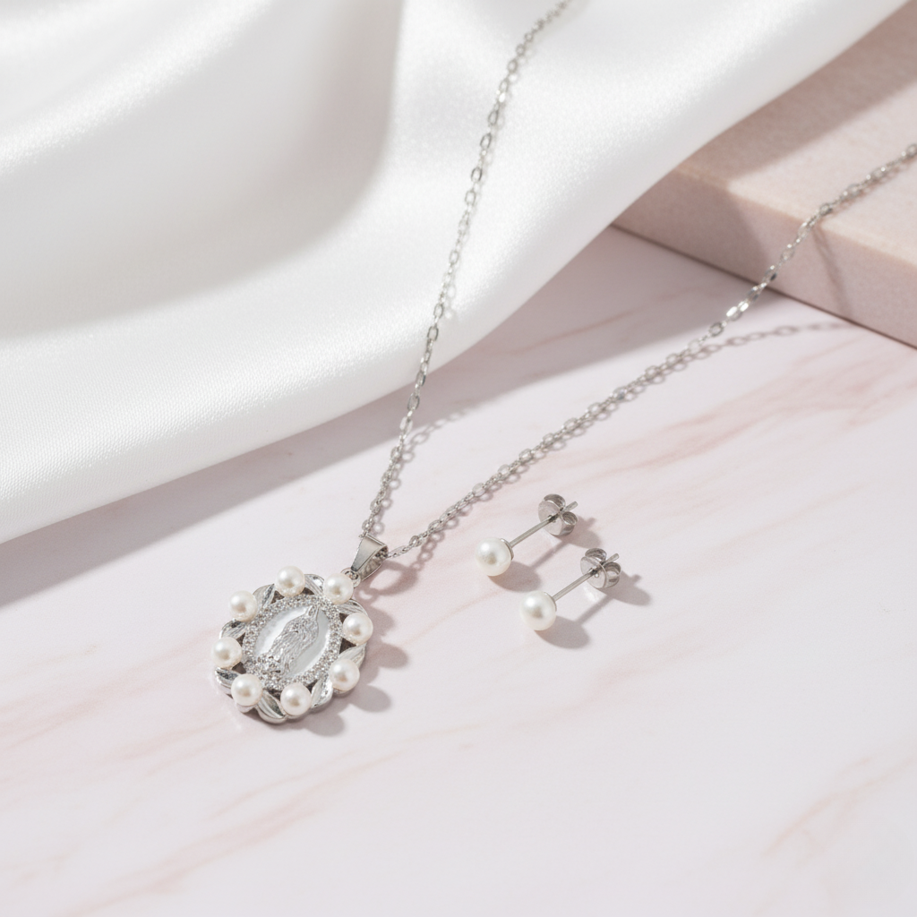 Collar con dije de la Virgen María en acero inoxidable 304, rodeado de Mini Perlas brillantes. Su diseño elegante y lleno de fe lo convierte en un accesorio especial para expresar devoción y estilo al mismo tiempo. Ideal como regalo espiritual o para uso diario.
