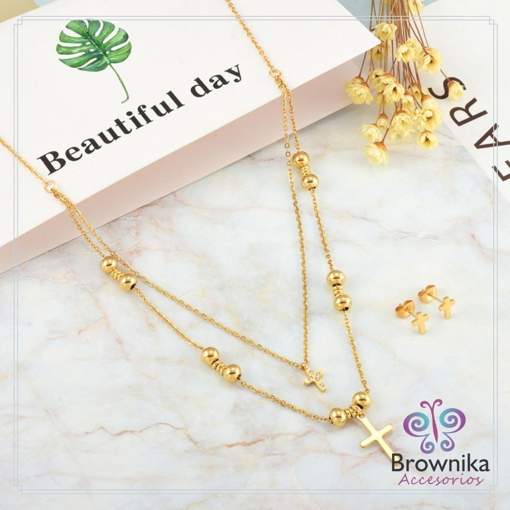 Cadena doble con dijes de cruces con juego de topos mini en Acero quirurgico 316L